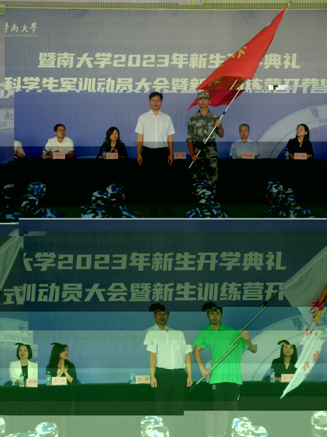 其間,翁健分别為新生訓練營、獨立營授旗,并與接旗的新生代表、軍訓教官代表合影留念。